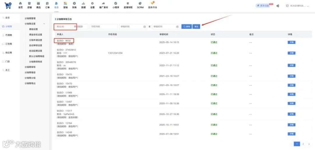 分销商审核日志列表增加会员ID筛选和数据展示以及导出列表增加会员ID