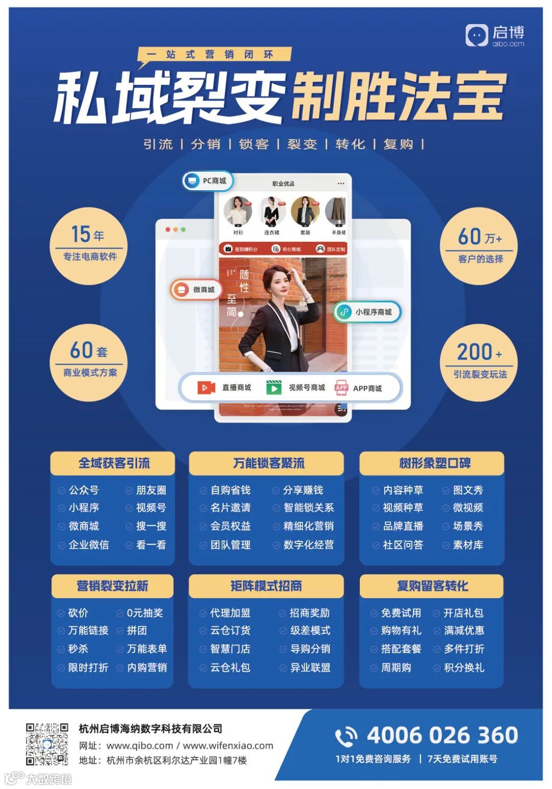 启博将会结合15年+成熟的电商系统开发经验和电商运营能力,以“品·效·销增长”为使命,为品牌提供包括微分销商城系统、本地生活商城系统、视频号分销系统、商业模式设计、行业洞察与咨询等SaaS工具与定制化服务。