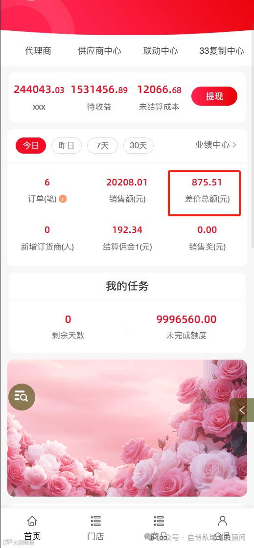 预存款订单中预存款进货产生的差价,在订货商中心业绩中统计