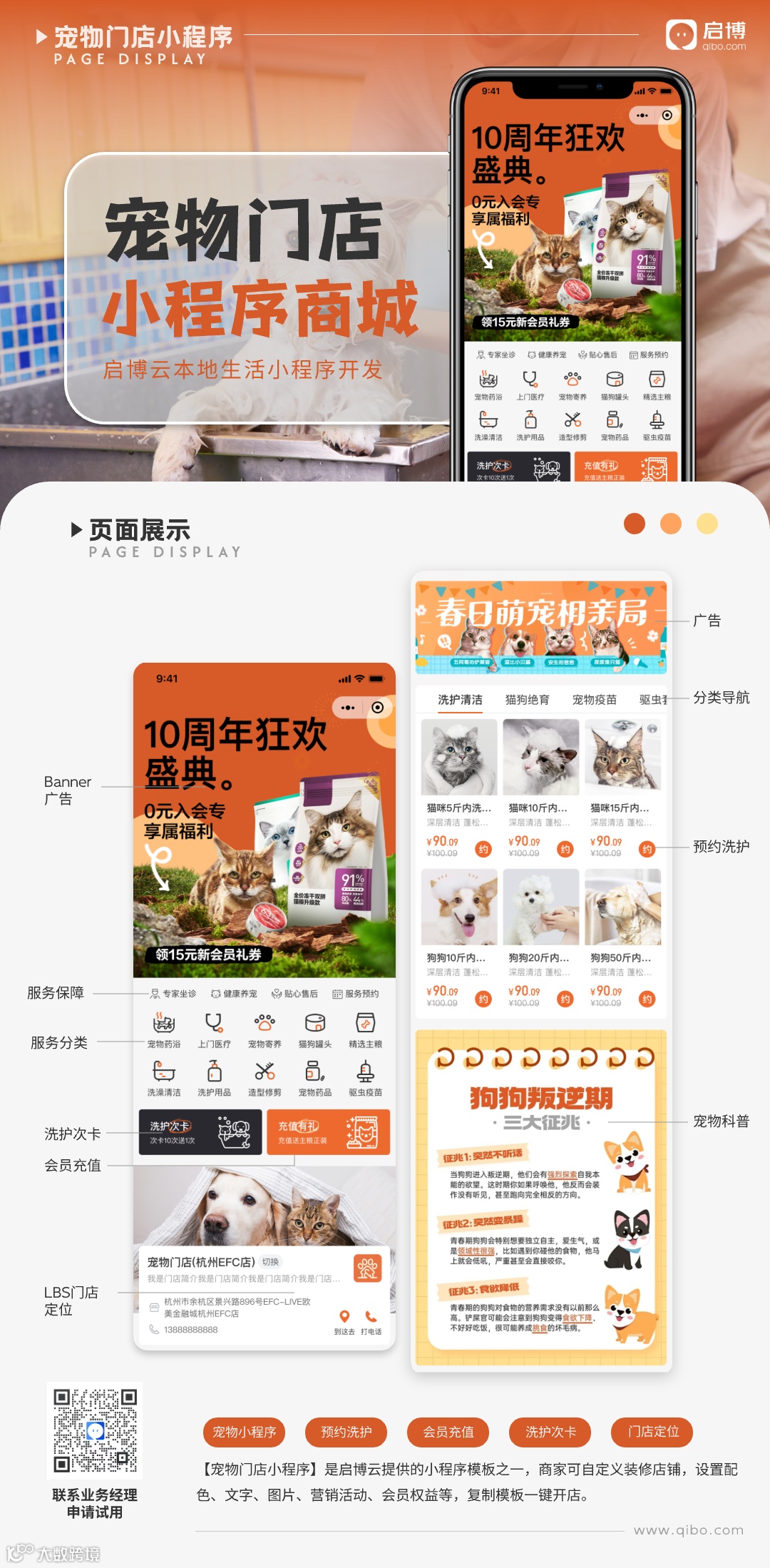启博云拥有宠物小程序商城系统解决方案,可扫海报中二维码添加启宝申请试用。