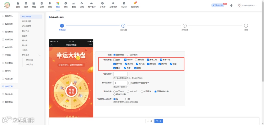 开通插件后,可针对身份的等级进行多选,未选中的等级会员进入活动页无法抽奖