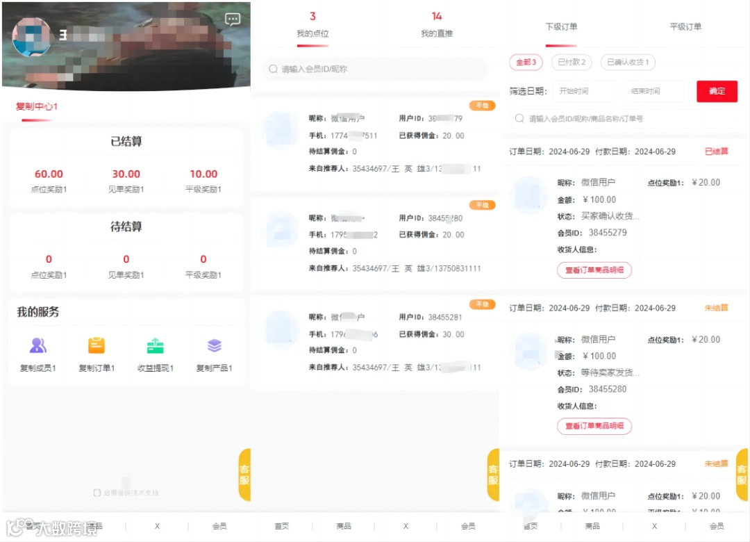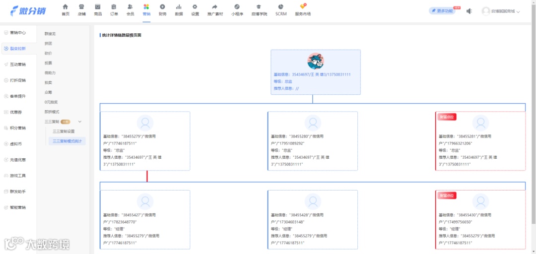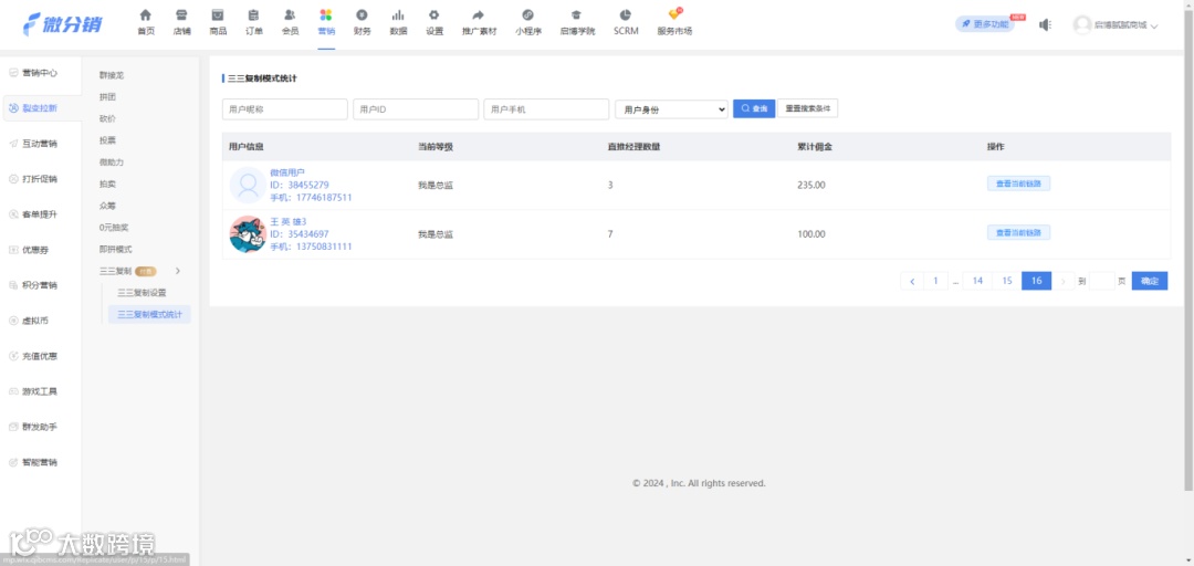 统计页面:统计所有参与了三三复制模式的成员信息和直推人数以及累积佣金