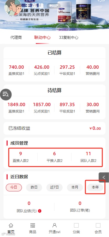 链动中心的成员管理部分,可以点击直接跳转页面,数据统计新增按自然年进行统计数据