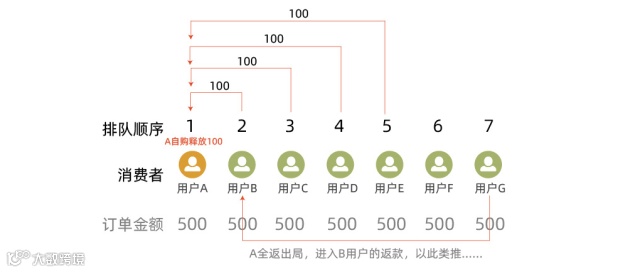 此时,用户A免单出局,用户B则成为新的排队首位,等待后续用户的加入,以此类推。