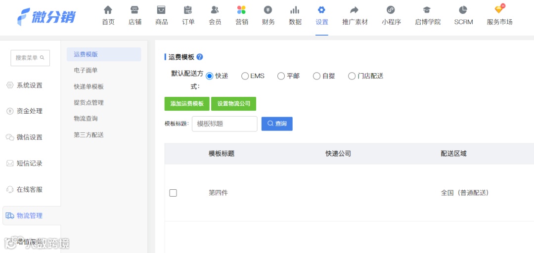 根据企业的实际业务场景,设置商品配送方式,微分销小程序商城系统支持“快递、EMS、平邮、自提、门店配送”,商家可以自定义配置,给多种经营模式商家提供开店支持。