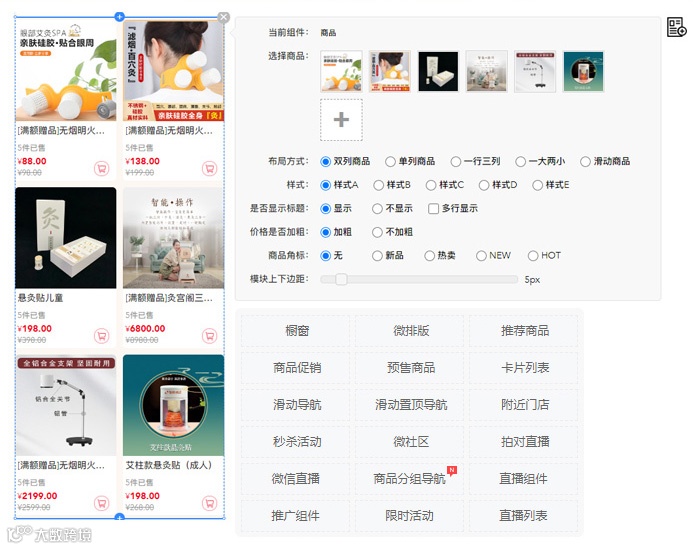商家可以直接替换商品文字和图片,快速上架商品,商品的布局方式有商品单列、双列、滑动等,还有新品、New、hot等多种商品角标展示方式,直接替换模板商品,快速上架到店铺直接卖货。