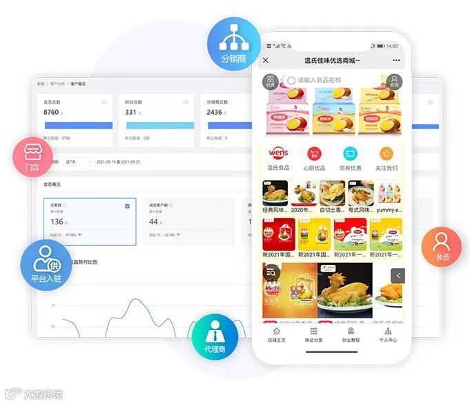 商家搭建了微信小程序自有店铺,商城内的商品除了自营销售,也可以发展会员成为分销商,人人都是小程序商城的分销员。