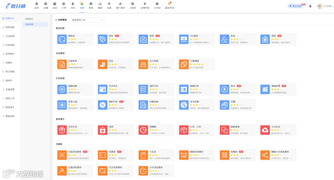小程序商城搭建完成后,就到了推广引流阶段,微分销小程序商城拥有近200+营销功能,帮助各位老板们裂变式拓客。