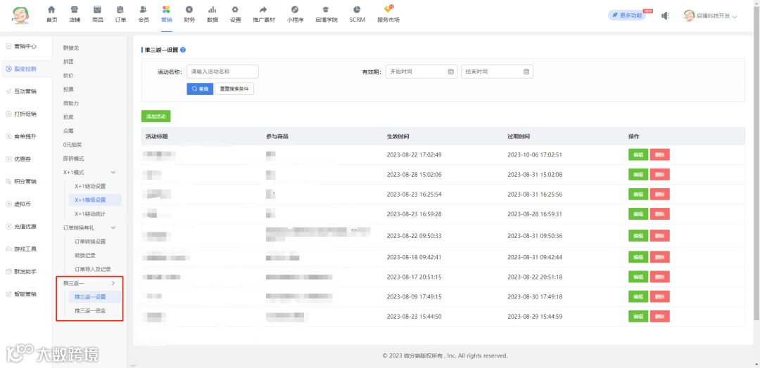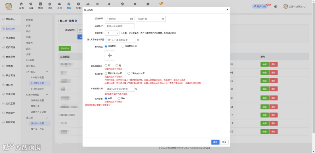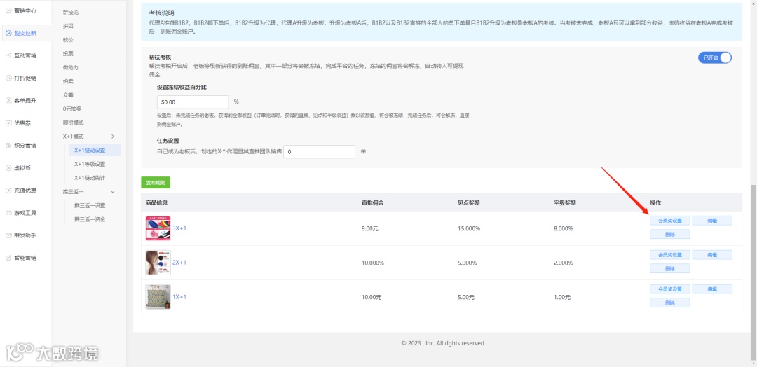 1、后台可以设置推X返一规则,可以选择一到十选择好数量,填写完点位对应的奖励。可以多选商品,选择的商品都会处于该规则中。
