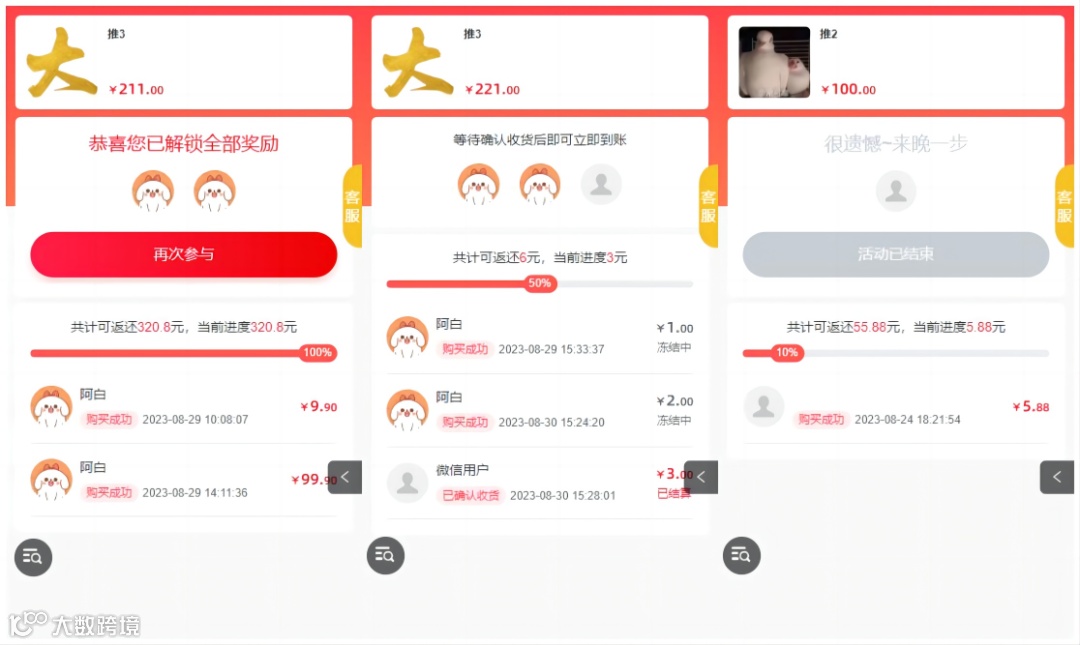 01、买家付款时结算:参与人付款后,返点位奖励给推广人(参与人退款后不退还点位奖励),推广满人后,无须等待订单完成即返还本金