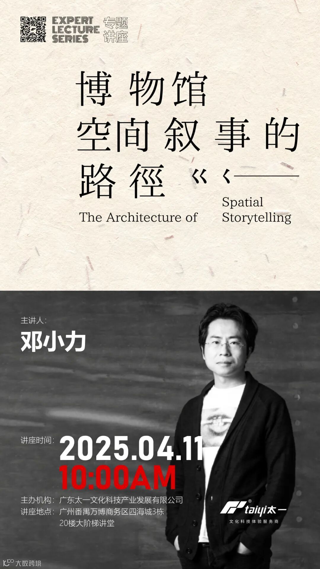 ——4月11 日(本周五)上午10:00,高级环境艺术工艺美术师、中国室内装饰协会高级室内设计师邓小力,带来《博物馆空间叙事的路径》专题分享会,解码博物馆如何通过空间设计激活历史叙事。