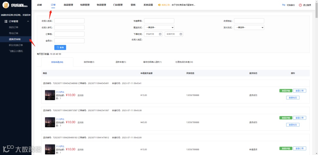 供应商后台的退换货列表显示的是,有关该供应商商品的所有退换货订单(处理权限走原逻辑)