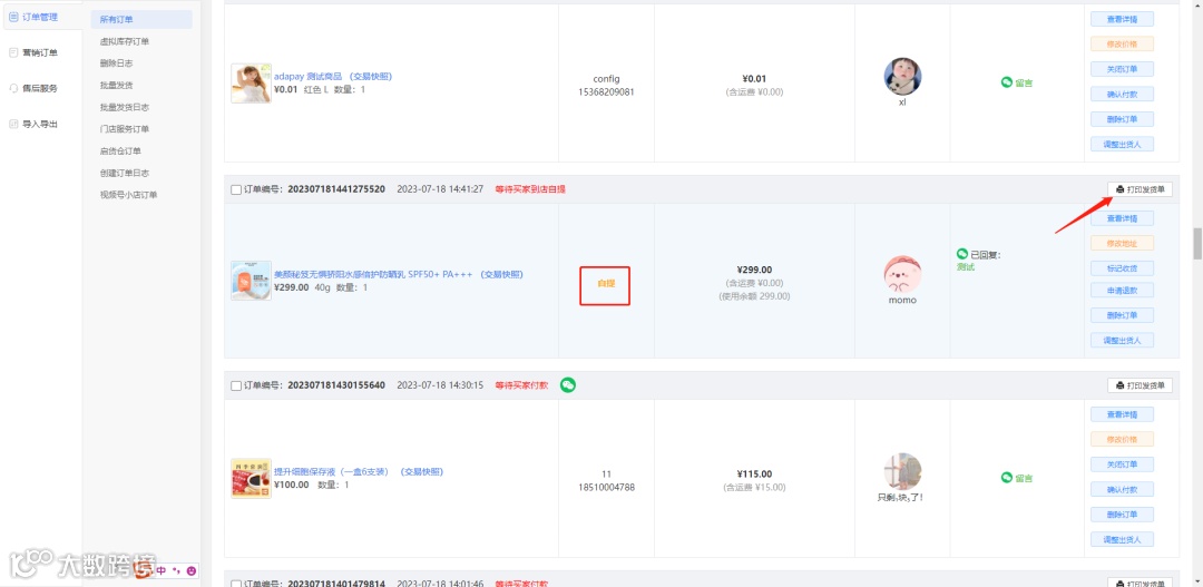 【订单】-【订单管理】-【所有订单】页面可以针对“自提”订单进行打印发货单