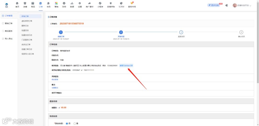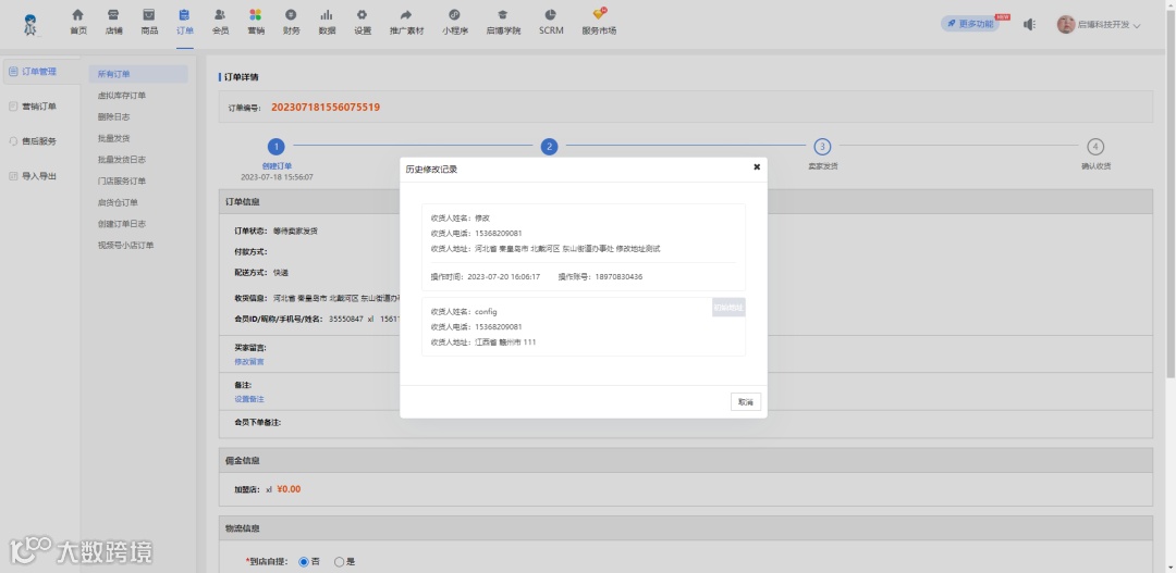 商家修改订单收货地址后,可在订单详情查看修改记录