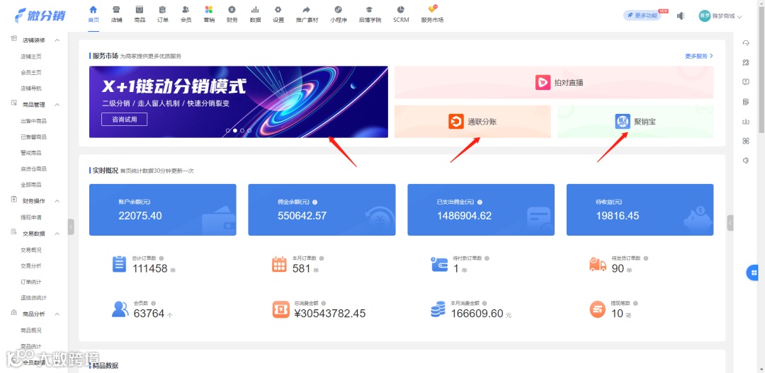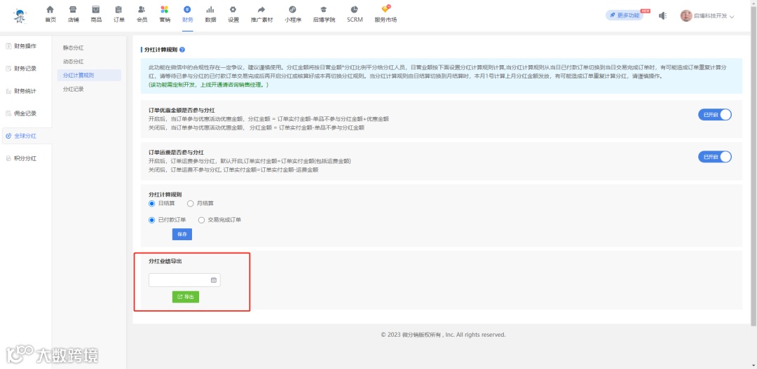 可根据“分红计算规则”的设置,导出对应结算周期(日、月)以及订单状态(已付款、交易完成)下的分红业绩的组成订单明细