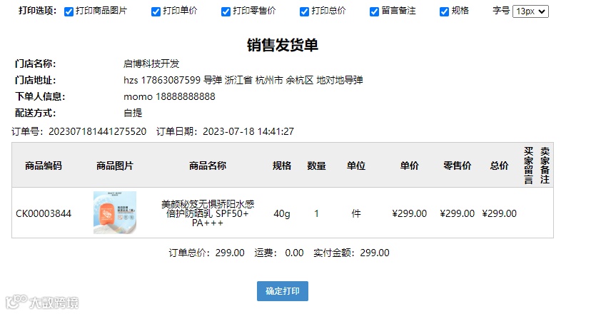 自提订单发货单操作及样式