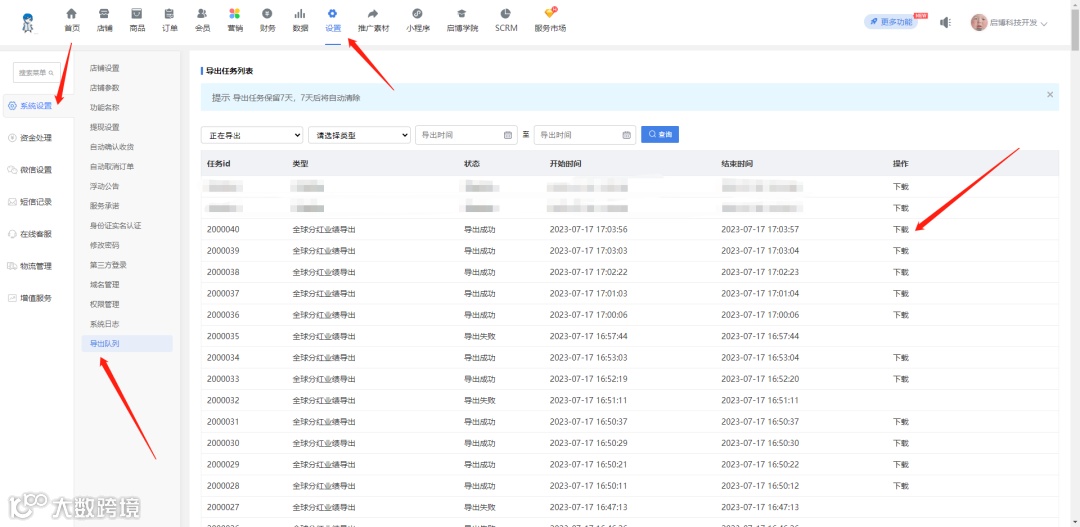 分红业绩导出,使用的是异步导出。再导出后需要到后台 【设置】-【系统设置】-【导出列表】页面中进行自主下载