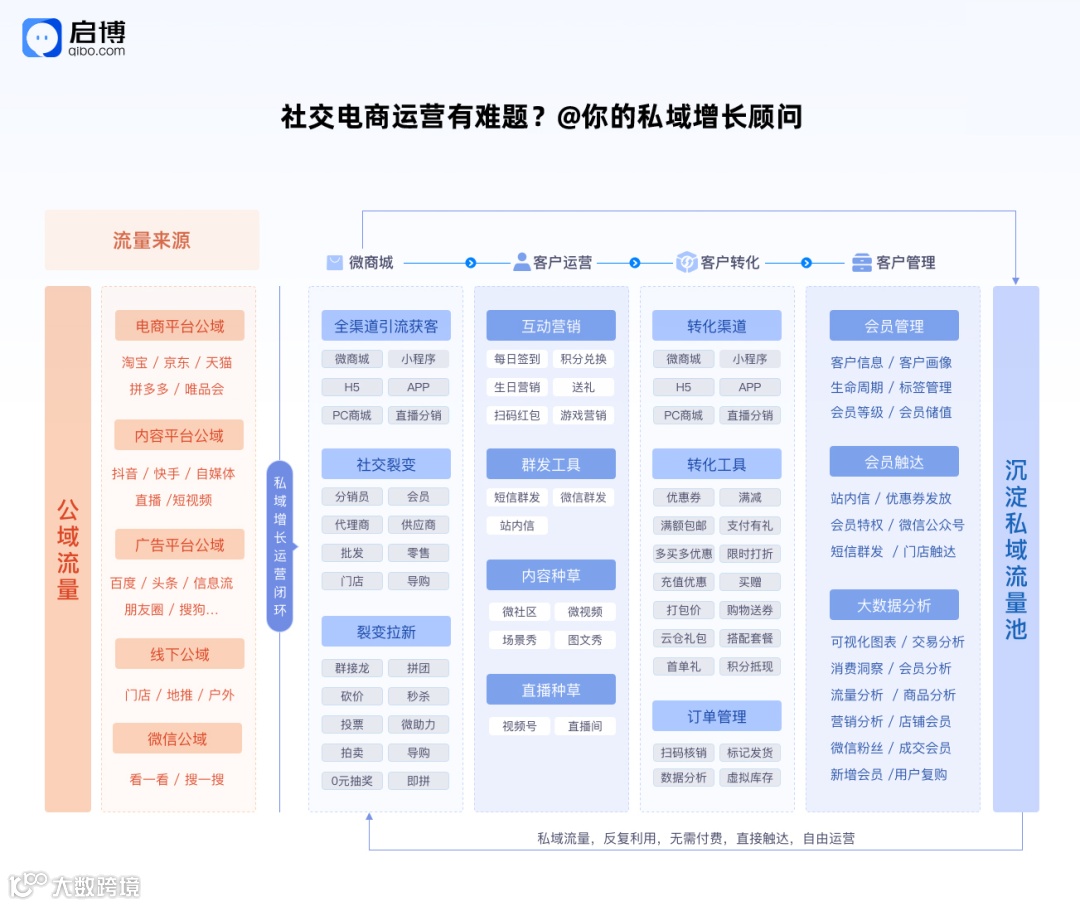 工具的出现改变了生产方式,而对于私域运营来说,工具提供的是降本增效,以及服务的价值。企业私域体系各环节,如获客、转化、运营、复购等,都有相应的数字化工具辅助执行。在2022年布局私域,运营工具的首要特点是,必须满足全链路的运营需求。