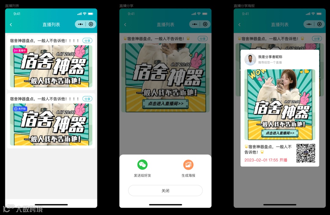 手机端的直播列表是用于C端裂变。用户将小店/视频号直播/视频号视频分享出去,被分享人(新用户)打开小店下单,系统内并不会新增上下级关系。C端分享商城内的直播列表页面,被分享人(新用户)打开列表页,系统内可以识别并自动锁定上下级关系。