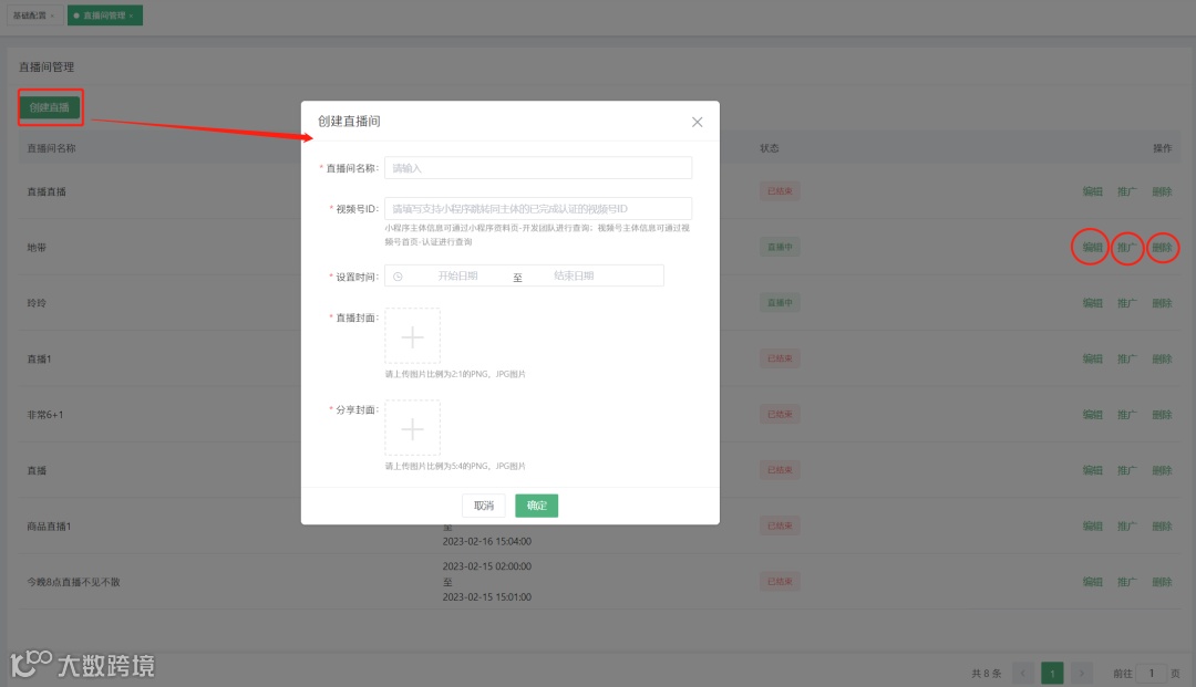 当前页面显示当前平台全部的直播列表,直播列表可以操作编辑、推广、删除。