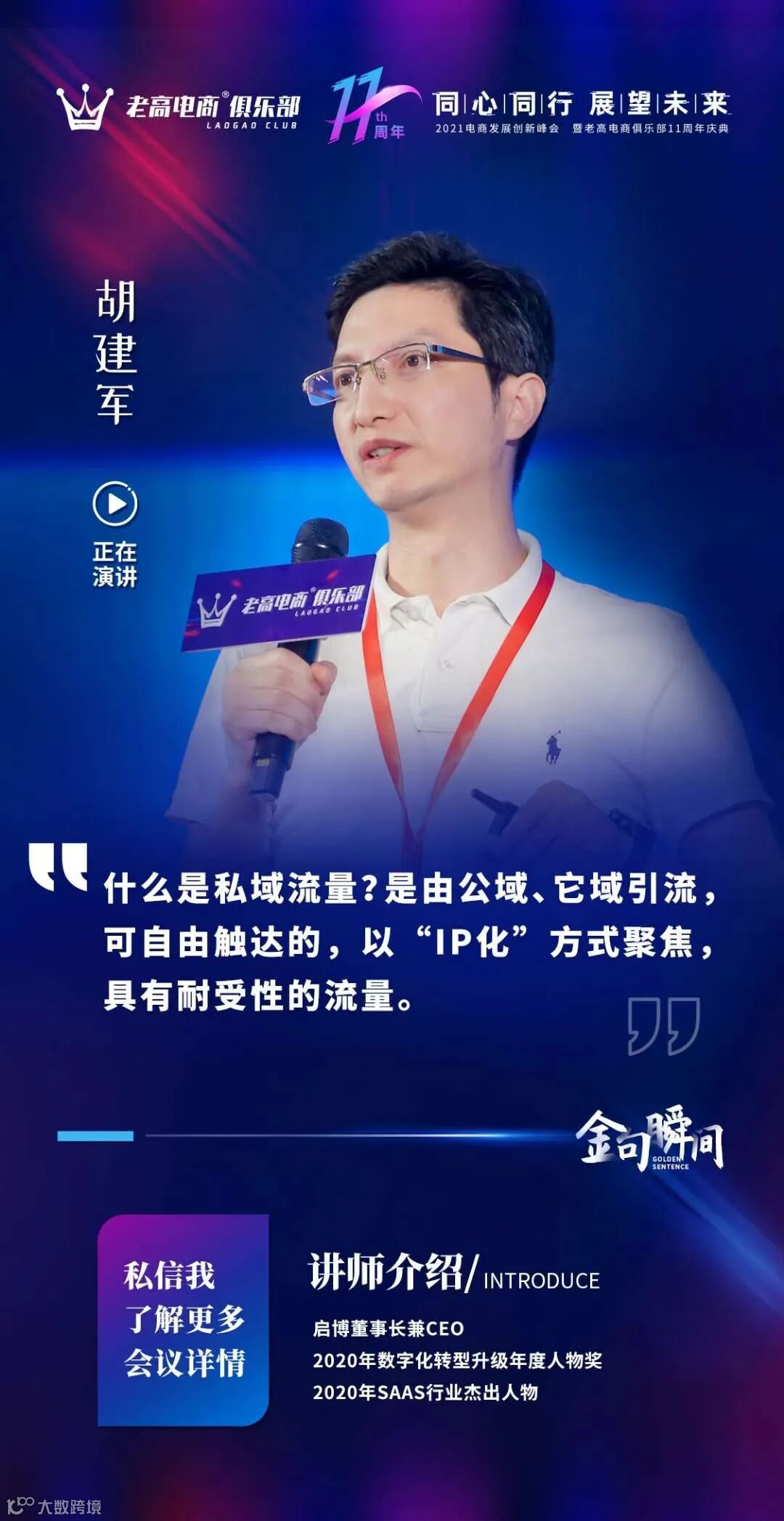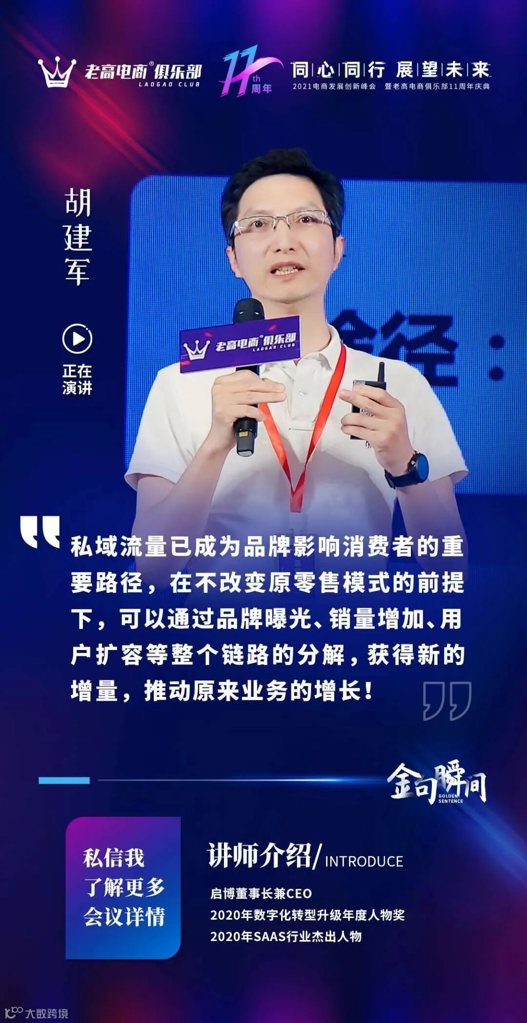 7月22日-23日,2021年电商创新发展峰会暨老高电商俱乐部11周年庆典在杭州西溪喜来登酒店隆重召开,启博董事长兼CEO胡建军先生作为重要嘉宾出席并做主题分享。