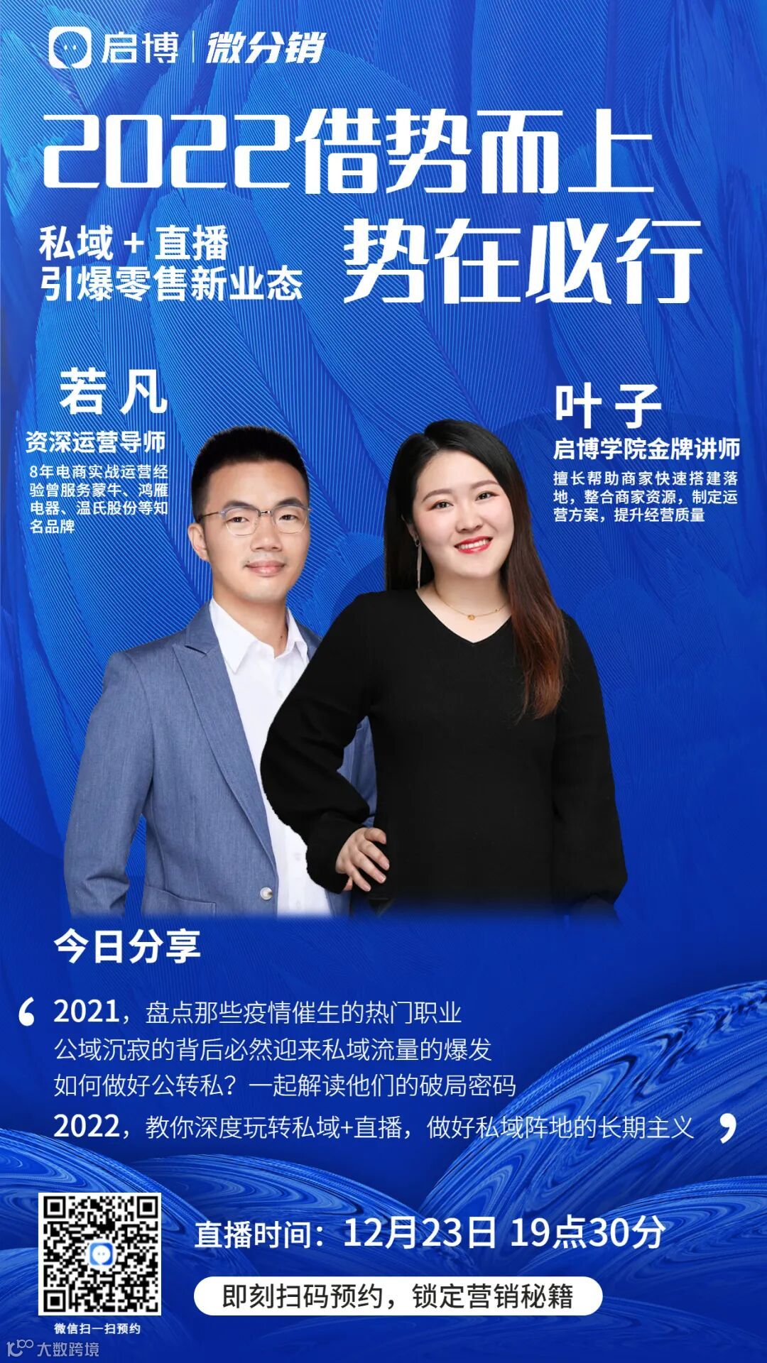 2021年12月23日晚19:30在“启博私域增长顾问视频号”,若凡和叶子会就公域转私域如何布局、如何做私域+直播、私域体系搭建等环节做重点讲述。如果你也是相关行业从业者或者产品也有类似的特点,欢迎扫码关注“启博私域增长顾问视频号”,第一时间收到直播提醒。