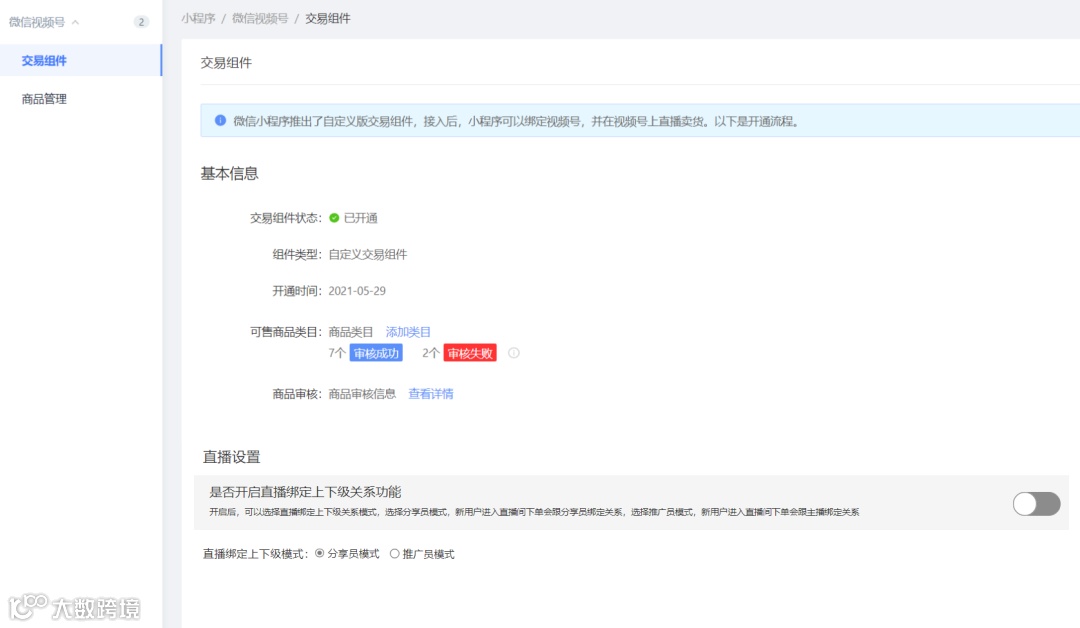 用户在视频号直播中开播后,新用户可以通过直播间进入商城下单绑定上下级关系;