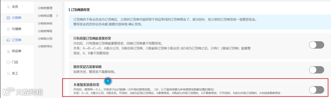 推荐奖设置中增加” 不重复发放推荐奖 “配置项