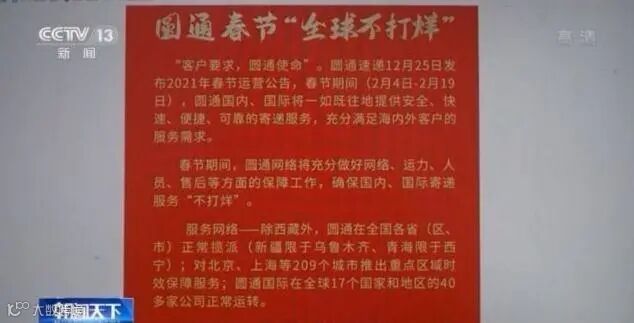 圆通速递客服:春节“全球不打烊”,圆通快递开启春节运营模式。