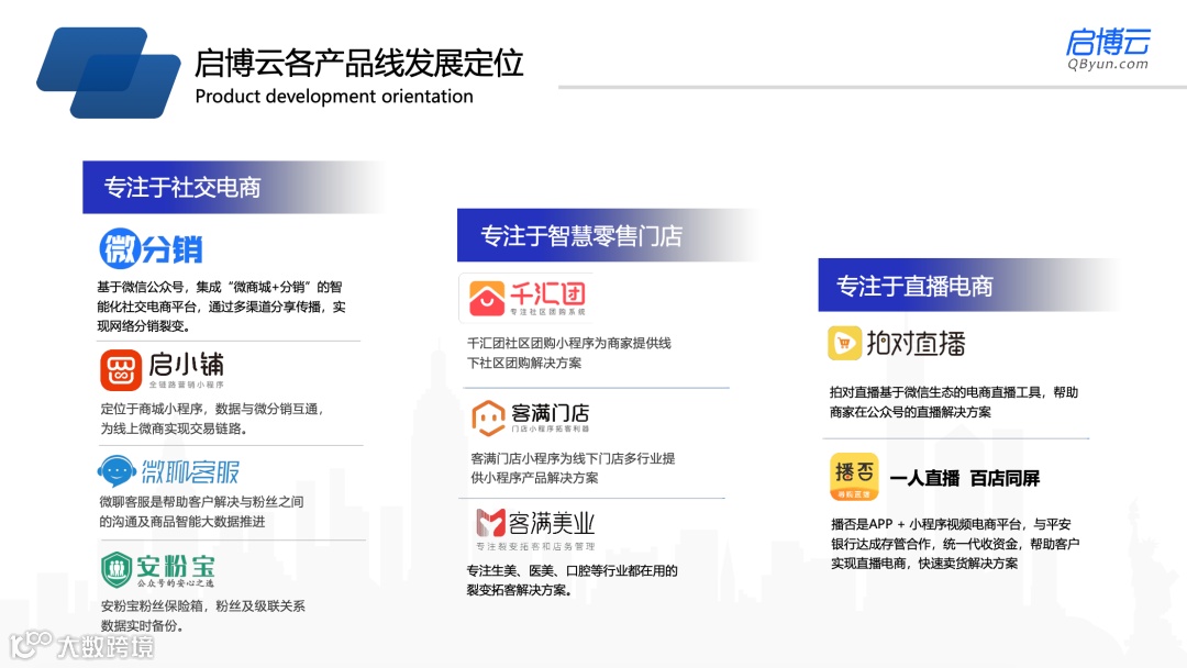 启博云旗下系列产品专注于社交电商、智慧零售门店、直播电商,分别服务了蒙牛、雀巢、九阳、一鸣真鲜奶吧、青岛啤酒、张裕、云集、美莱医疗美容等知名品牌,赋能企业进行数字化转型、构建私域流量和沉淀用户资产。