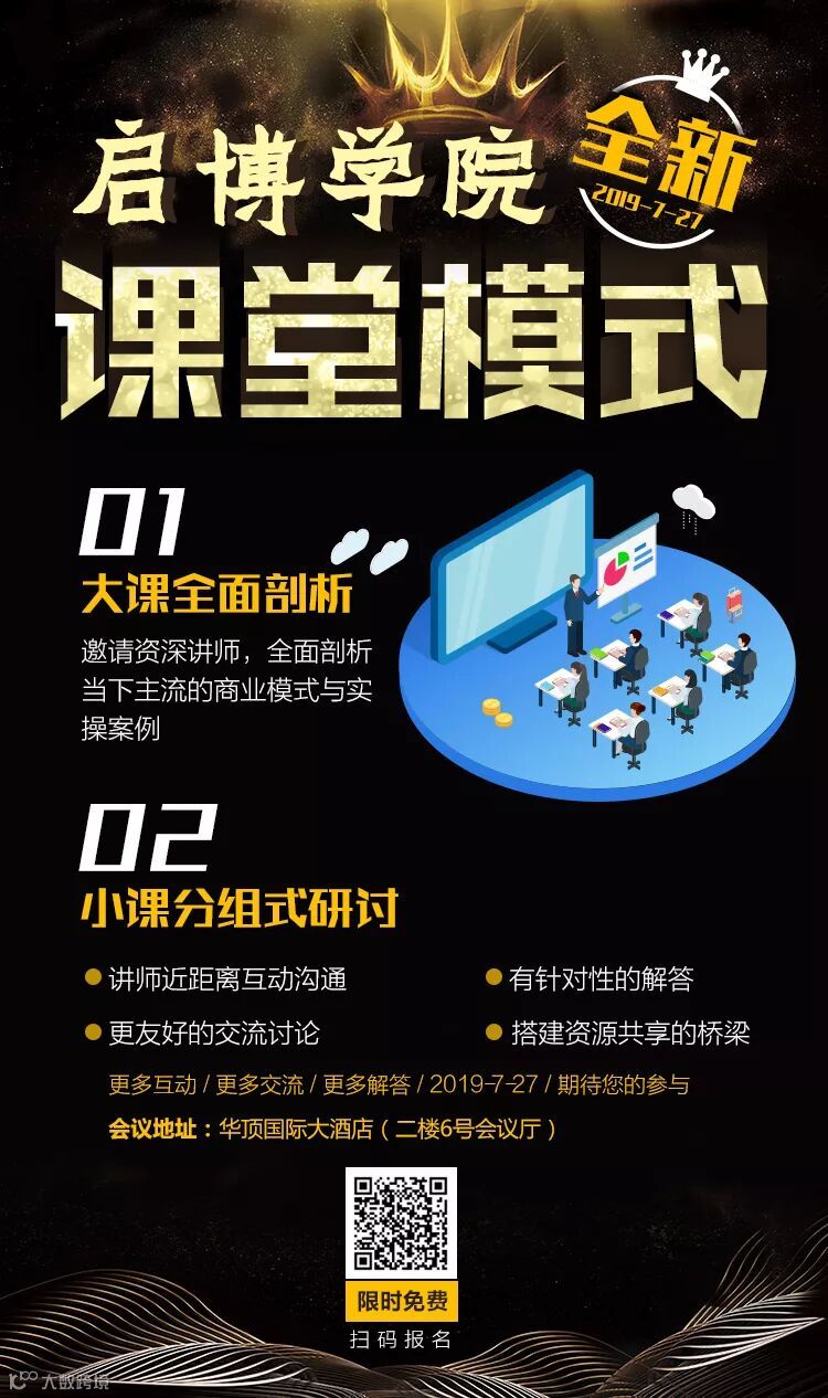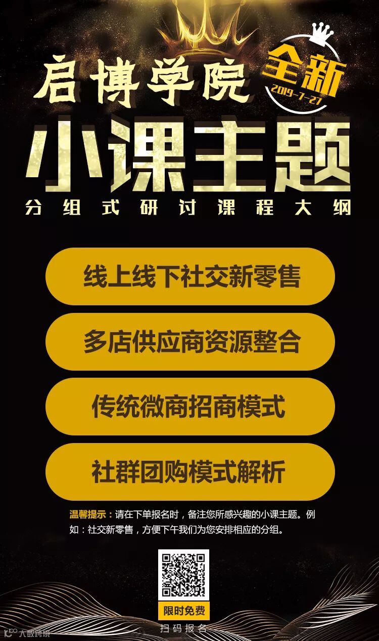 此次7月27日的社群电商模式讲解会议,一共两位导师来进行讲解,主要从1、传统企业如何利用社交新零售转型,2、社群团购模式讲解,同期还将会有一个全新的模式亮相—启博学院小课堂,此次的小课堂将细分行业,细分模式,近十位专业导师进行面对面一对一的专题讲解,深入探讨商业创新模式、前沿技术应用和市场发展格局。