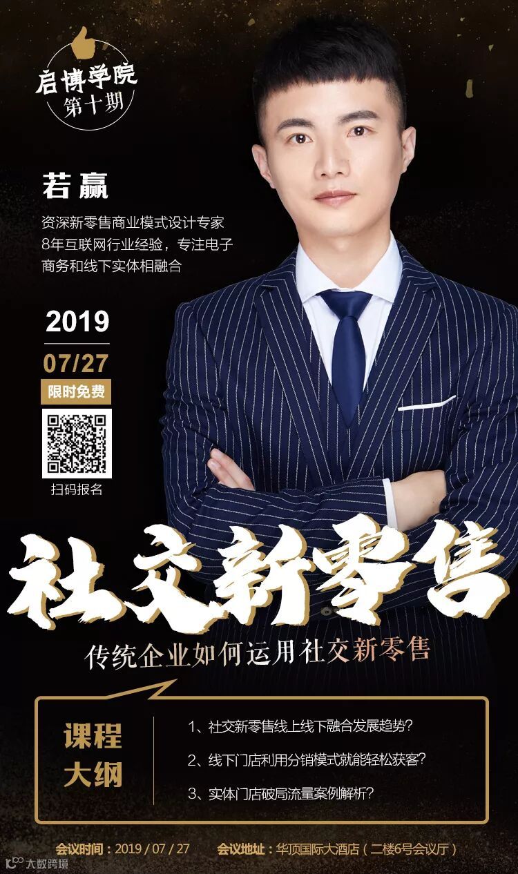 那么如何抓住这个风口至关重要,为此2019年7月27由启博学院主办的——《解密社群电商与社交新零售的商业模式》线下交流会议将在杭州华顶国际大酒店隆重召开。