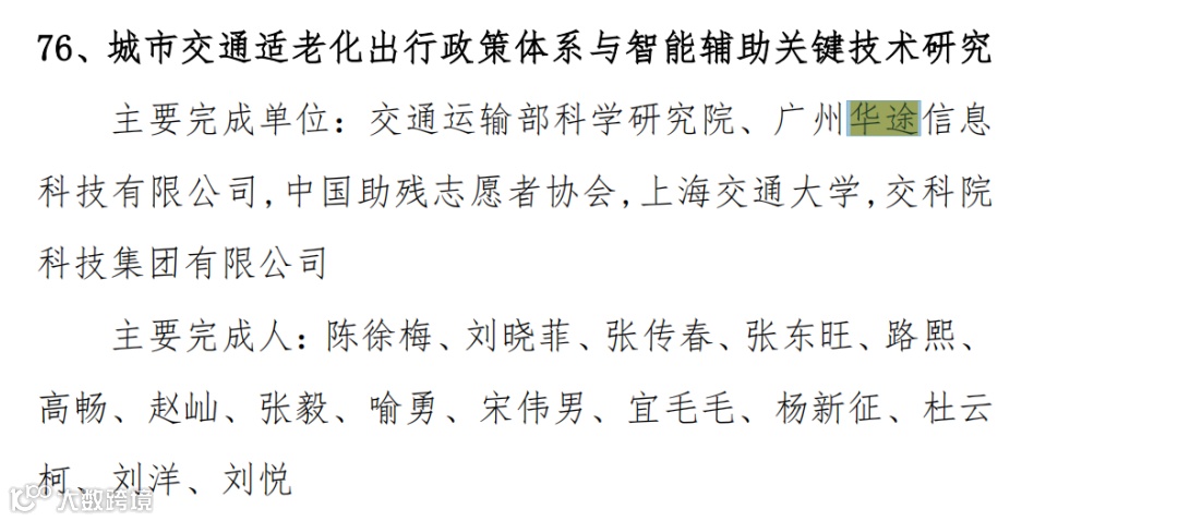 近日,2023年度中国交通运输协会科学技术奖评审结果在中国交通运输协会官方网站公示完毕,广州华途信息科技有限公式参与申报的"城市交通适老化出行政策体系与智能辅助关键技术研究”项目喜获中国交通运输协会科学技术奖“科技进步奖”一等奖。