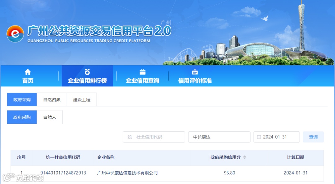 根据广州公共资源交易信用平台2.0中“企业信用排行榜”最新显示,中长康达凭借丰富的项目管理经验、雄厚的技术力量和良好的企业信誉,在近3万家政府采购供应商中脱颖而出,荣获95.8分,并列第一。