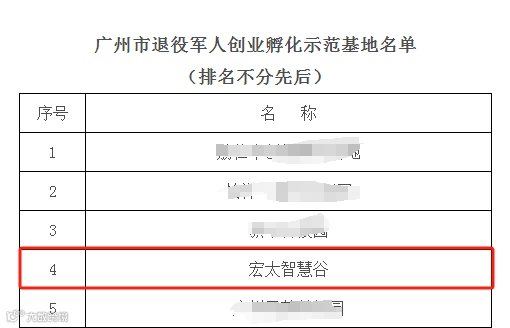 1月9日,根据广州市退役军人创业孵化示范基地创建工作安排,经所在区推荐、材料审核、实地核查,广州市退役军人事务局公布12家广州市退役军人创业孵化示范基地名单,宏太智慧谷荣获“广州市退役军人创业孵化示范基地”称号。