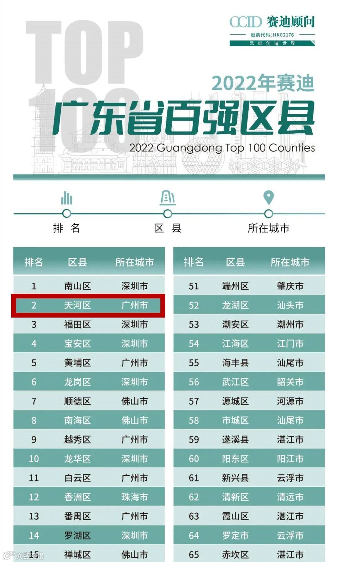 11月上旬,由赛迪顾问编制的《2022广东省区县高质量发展百强研究》在2022县域经济创新发展论坛广东分论坛上发布。此次广东省百强区县榜从经济发展、科技创新、生态环境等维度出发,系统比较了各区县发展水平,天河从全省122个区县中脱颖而出,位列全省第二,在高质量发展道路上愈行愈远。(数据来源:赛迪顾问)