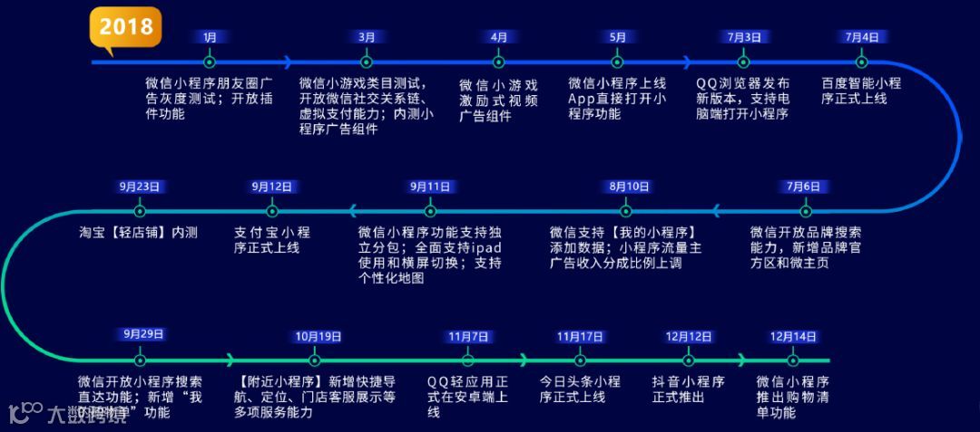 2018年7月,百度智能小程序正式发布。2018年9月,蚂蚁金服宣布正式成立支付宝小程序事业部。紧接着,今日头条正式发布小程序,成为继BAT之后,第四个推出小程序的巨头。