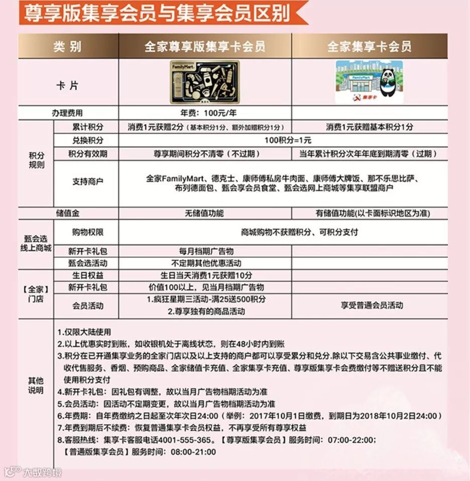 全家尊享版集享卡会员卡每年需缴纳100元年费,但是消费1元可以累计2分,会员期间积分不清零。全家集享卡无需缴纳年费,消费1元累计1分,会员积分年底清零。