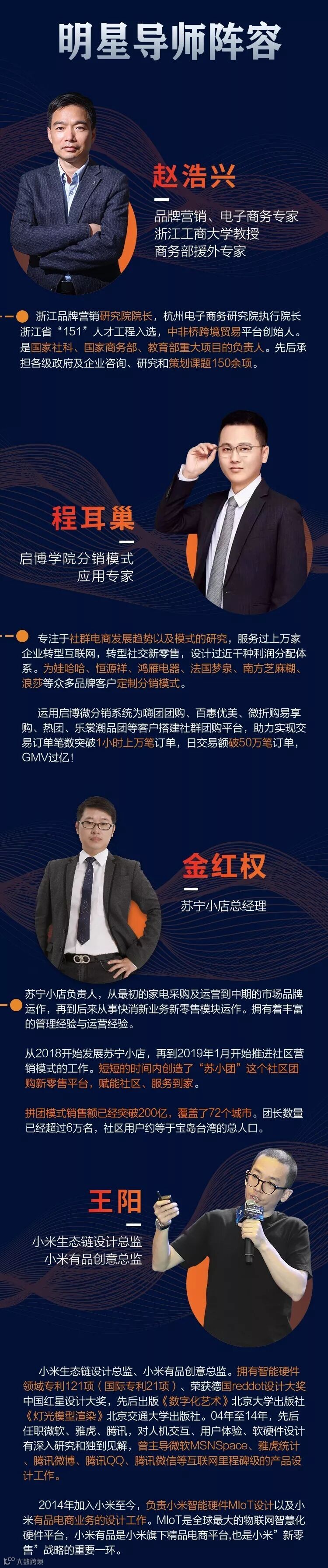 本期会议共邀请四位大咖老师,每一位讲师在每个板块领域都有知名代表作和丰富的实操经验与理论积累,在本次的新零售高级研修班上他们将为大家分享他们是如何入局新零售,如何打造“私域流量”以及这一路上走过的坑和凝练的知识体系。