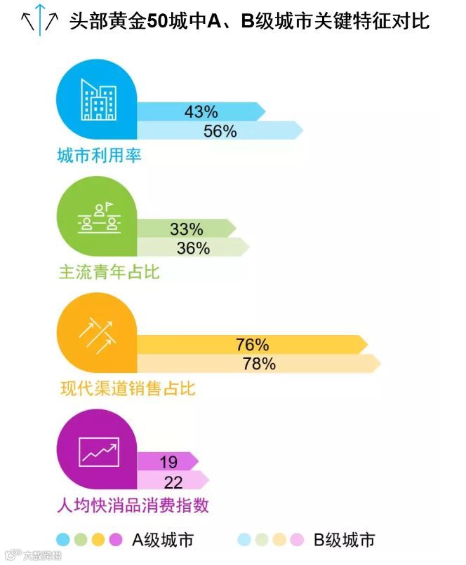 此外,表现优异的城市在现代场景、便利生活、良性均衡、活跃市场等方面,存在一定共性,但也各具特点。尼尔森报告显示,头部黄金50城中的B级城市与A级城市相比,在四个关键特征上表现更加优异:1)城市利用率上表现更佳,B级城市利用率为56%,A级城市为43%;2)36%的主流青年占比高于A级城市的33%;3)现代渠道销售占比为78%,略高于A级城市的76%;4)A级城市的人均快消品消费指数为19,B级城市则达到了22。