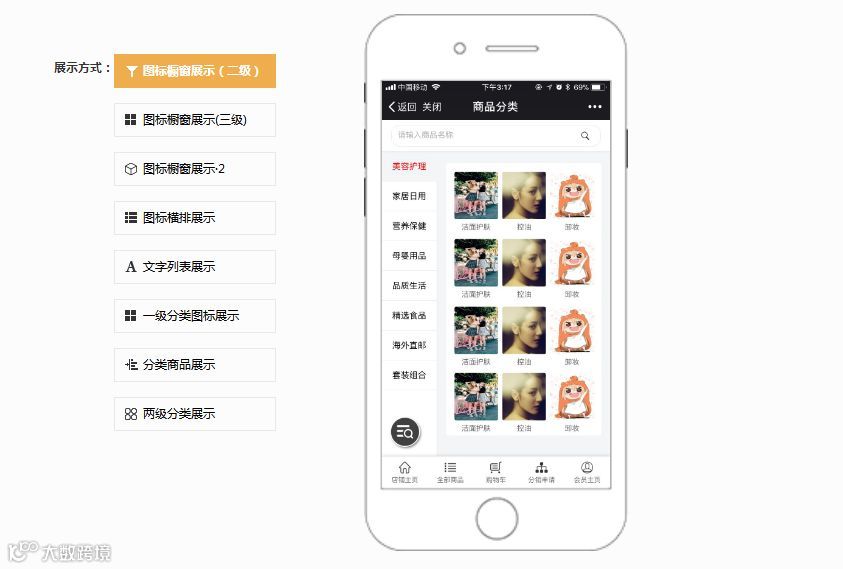 商品分类最多只能添加三级,有多种展示方式可以选择。