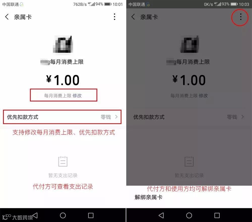 亲属卡功能与支付宝亲密付相似,用户可在微信上赠送给父母、子女亲属卡,对方消费时由赠送人来代付。在使用亲属卡消费时,消费资金将自动从代付方的支付账户扣除,上限3000元。代付方可设置亲属卡的每月消费额度上限,每月自动延续。