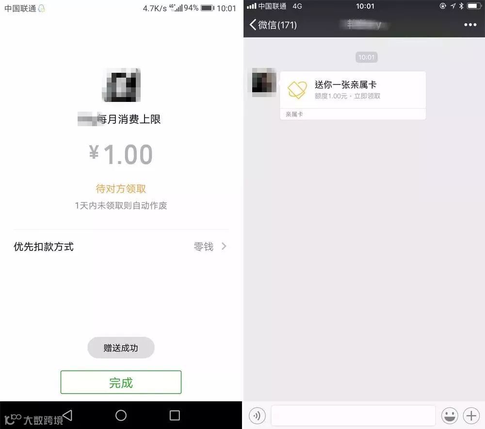 也许是微信支付更偏向于零碎场景,亲属卡的额度相比支付宝亲密付的 100~20000元,显得更为接地气。填写消费上限后需输入支付密码,再进行赠送,等待对方领取。