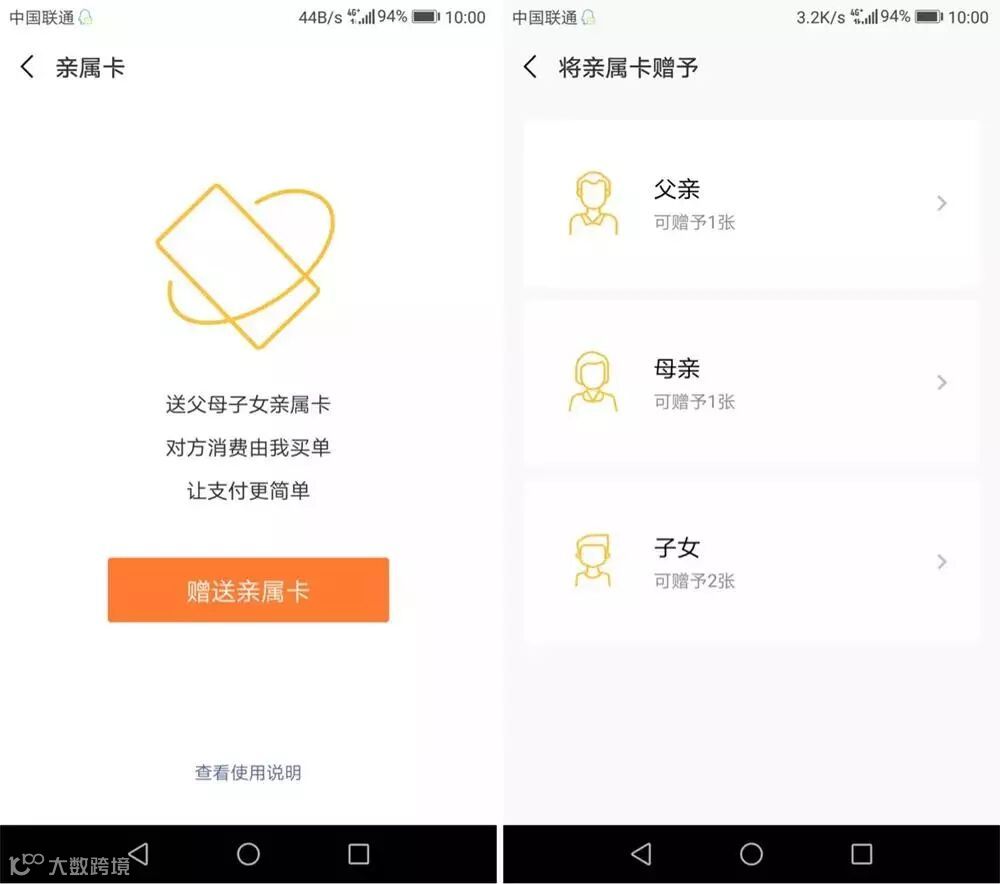 赠送父亲、母亲、子女“亲属卡”,主要是让父母付款更简单,同时,因为可以看到使用方使用亲属卡支付的消费记录,家长也可以通过这种方式给孩子零花钱,能更直接地掌握孩子零花钱的去向。