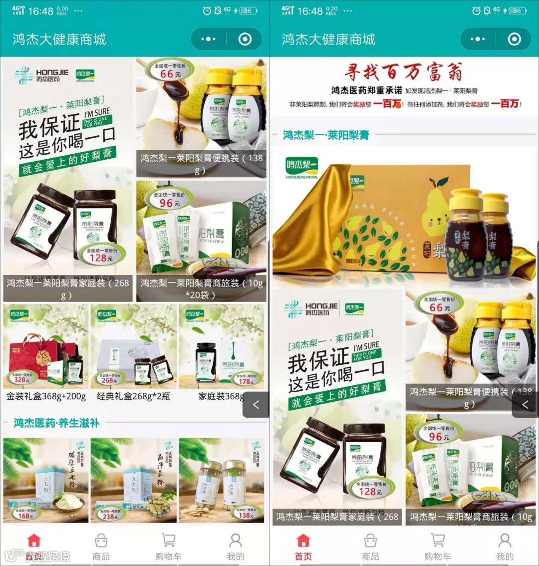 在“好货低价”方面,鸿杰大健康商城里的“莱阳梨膏、西洋参片、胖大海”等,全部采用全国统一零售价,最大限度的保障消费者的权益。并且其还在商城内发布公告称,任何发现鸿杰梨一·莱阳梨膏非莱阳梨熬制或者含有添加剂的人,都可以拿到100万的答谢奖励。