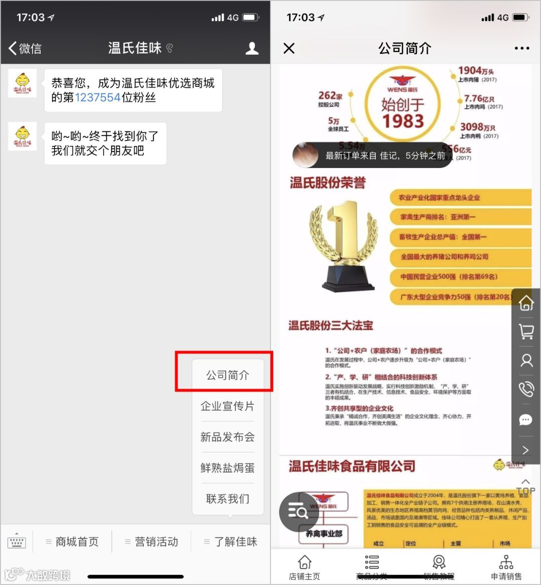 温氏佳味于微信公众号内搭建微商城,打通线下线上用户群体,通过分销模式吸粉数量达百万级别。