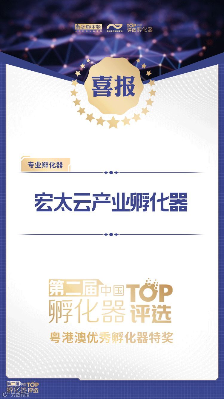 6月21日,由南方都市报社、国际数据集团(IDG)发起的“中国孵化器TOP评选”在2019中国创新创业成果交易会隆重揭晓。宏太云产业孵化器凭借优异的孵化成绩获评第二届中国TOP孵化器评选粤港澳优秀孵化器特奖。