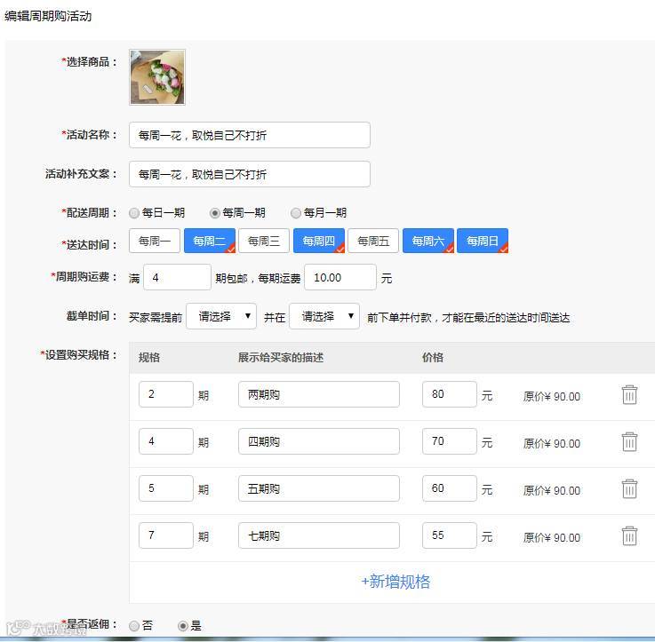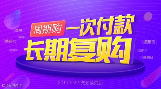 所谓周期购,即用户一次下单,商家按已设定的周期多次发货。此营销工具适用于鲜花牛奶、粮油米面、茶饮酒水、书刊杂志、医药保健、猫狗粮等高频次消费刚需品。