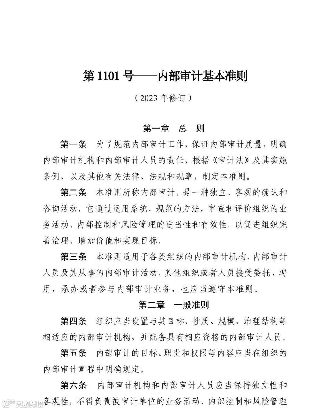 为了适应新时期内部审计的发展要求,进一步增强内部审计基本准则在内部审计准则体系中的统领性和指导性,更好发挥内部审计基本准则的作用,我会组织修订了《第1101号——内部审计基本准则》,经中国内部审计协会第七届常务理事会第十一次会议审议通过,现予以印发,自2023年7月1日起施行。2014年1月1日起施行的《第1101号——内部审计基本准则》同时废止。
