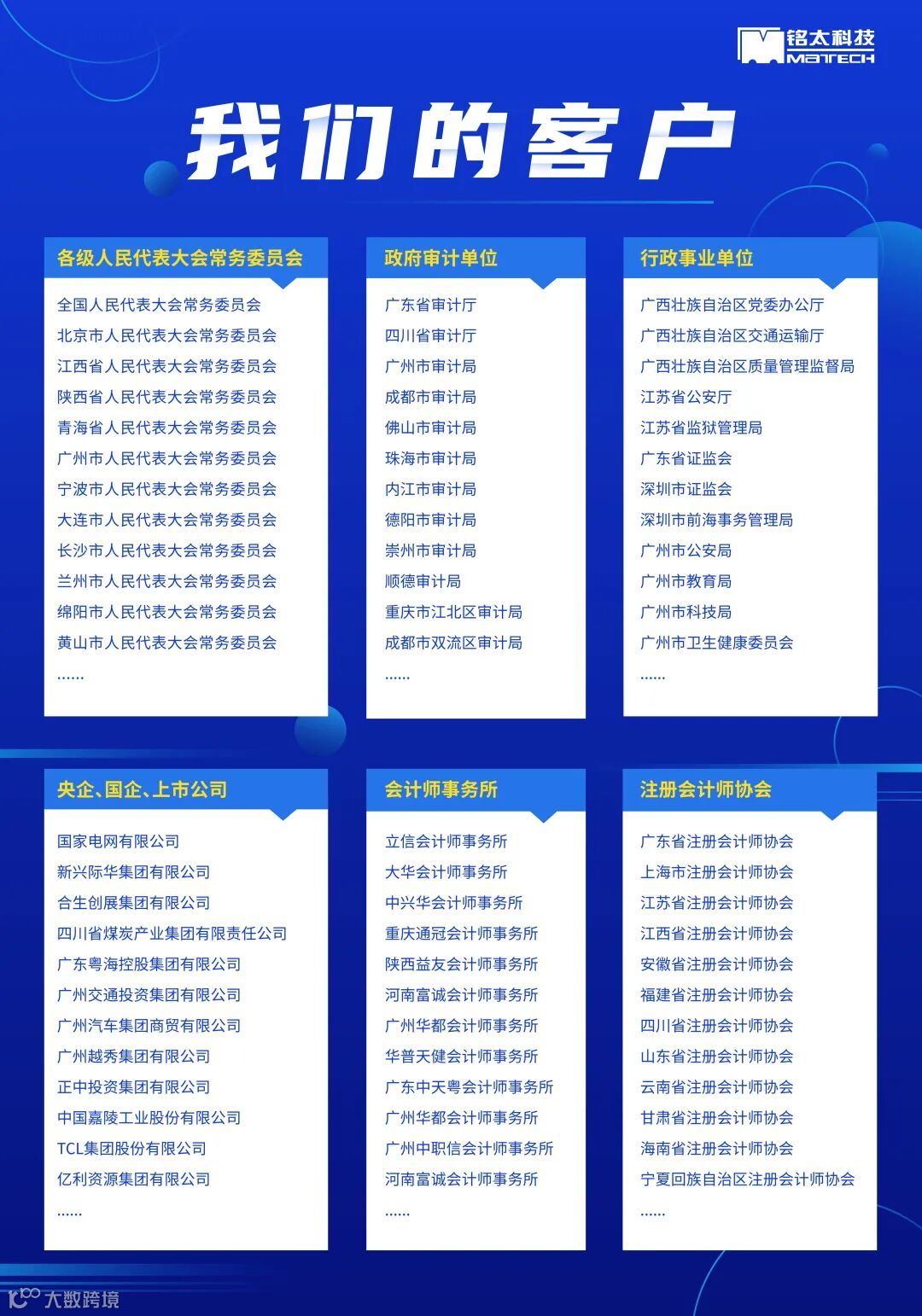 铭太科技现已为全国范围内的1000+政府部门及行政单位,近10000家金融机构、央企国企、上市公司、会计师事务所提供专业的产品和服务